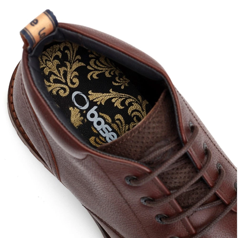 Introducing Canmore Grain Brown by Base London, the quintessential leather Chukka Boot for men. Crafted with premium grain leather uppers, this boot flaunts a branded nylon pull tab and a cleated rubber sole for exceptional grip. The metallic rivet details and padded leather ankle cuff add a touch of rugged charm, while the Ortholite insole promises all-day comfort. Perfect for those crisp autumn weekends when style and practicality are paramount. Lace up the Canmore and conquer the season with flair.